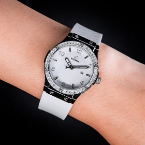 Thiết kế đơn giản nhưng không hề nhàm chán, với những hạt đá nhỏ xinh đính trên mặt đồng hồ làm tay nàng thêm nổi bật.